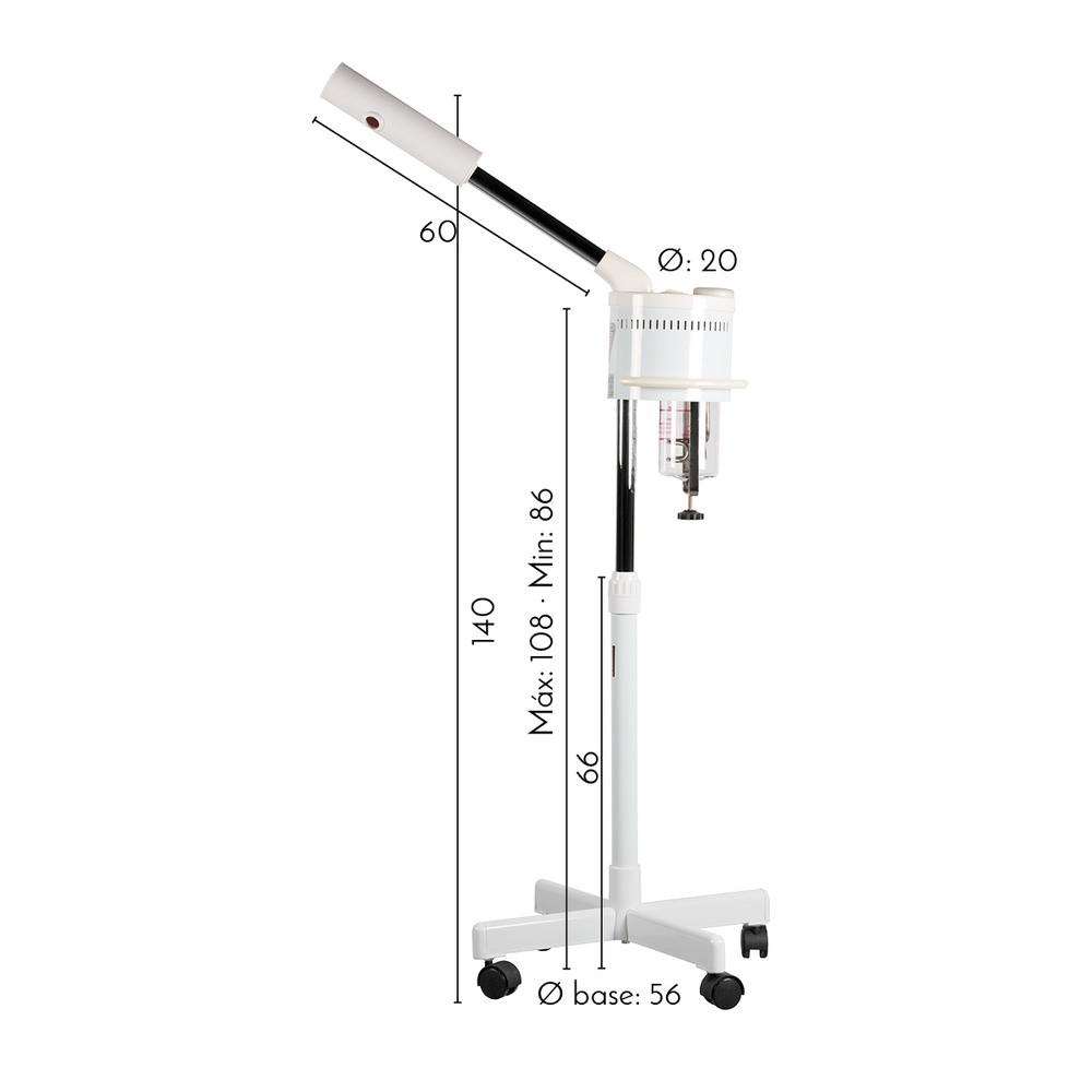 This vaporizer stands out not only for its functionality but also for its ergonomic design and technical specifications that ensure efficient and safe use in the professional environment. With a power of 650W and a voltage of 220V/50Hz, the device meets the standard energy requirements of beauty salons. Furthermore, its adjustable height range between 86 cm and 140 cm, along with a 60 cm long arm and a base with a diameter of 56 cm, make it adaptable to different spaces and uses.
