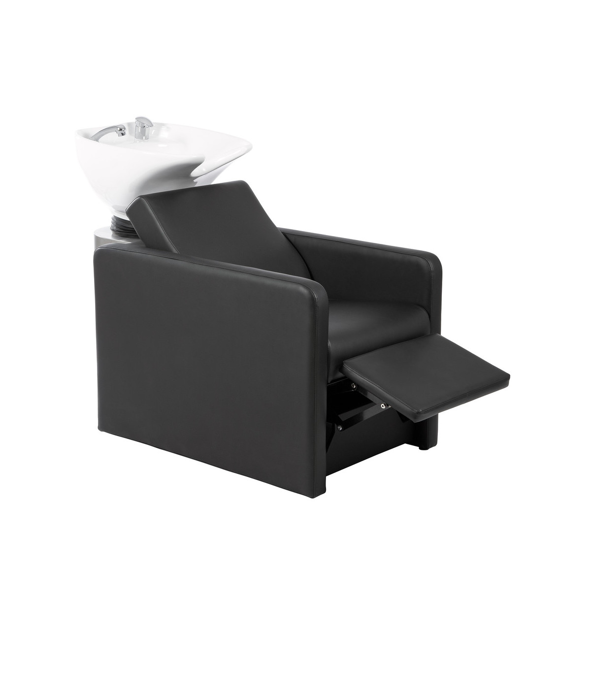 Motorized Functions: This backwash unit features a chaise-longue type foldable footrest, controlled by integrated buttons within the unit itself. This function allows the client to fully relax while receiving the service.