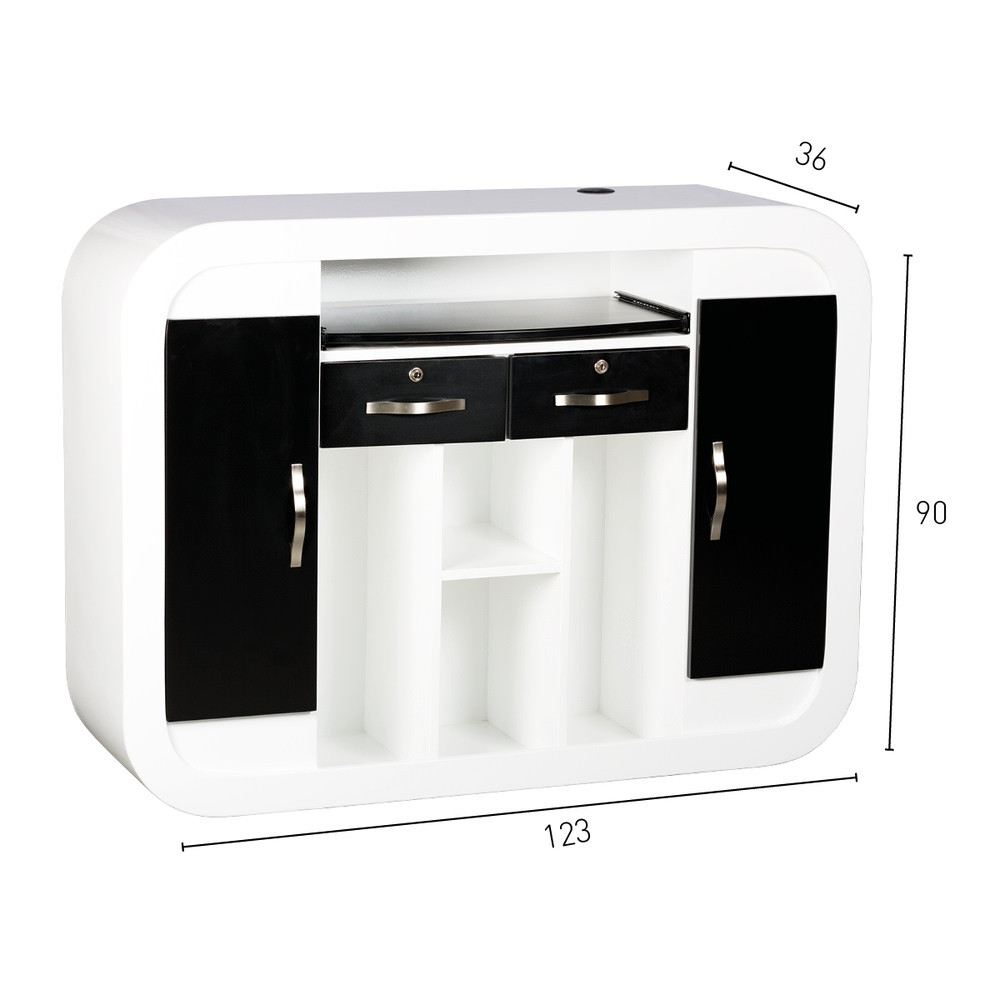The curved design of the Hair Salon Reception not only adds a modern and sophisticated touch but also maximizes space, allowing for closer and more personal interaction with the client. Its black and white finishes are not only aesthetically pleasing but also easy to clean, ensuring that your counter always looks impeccable.