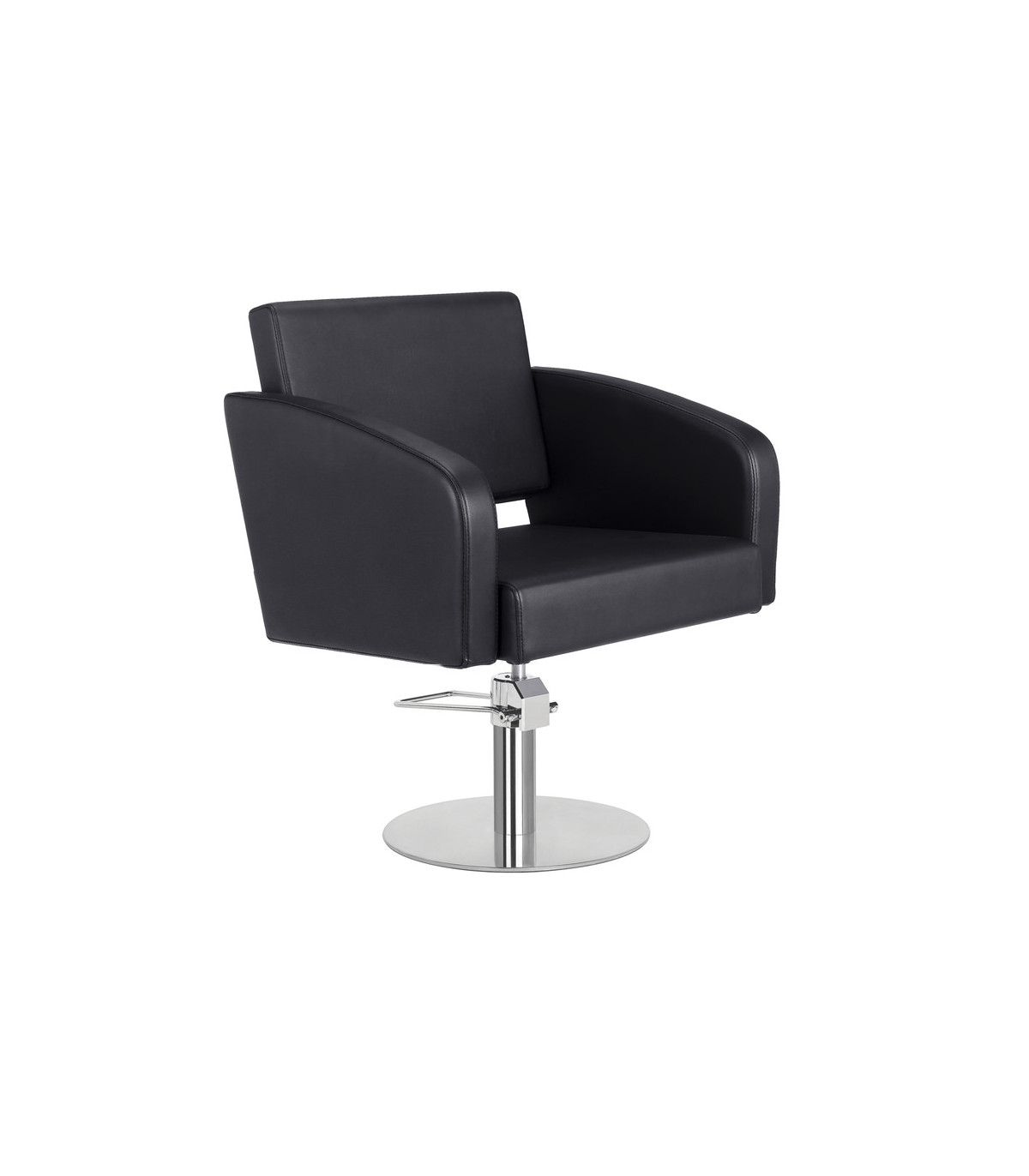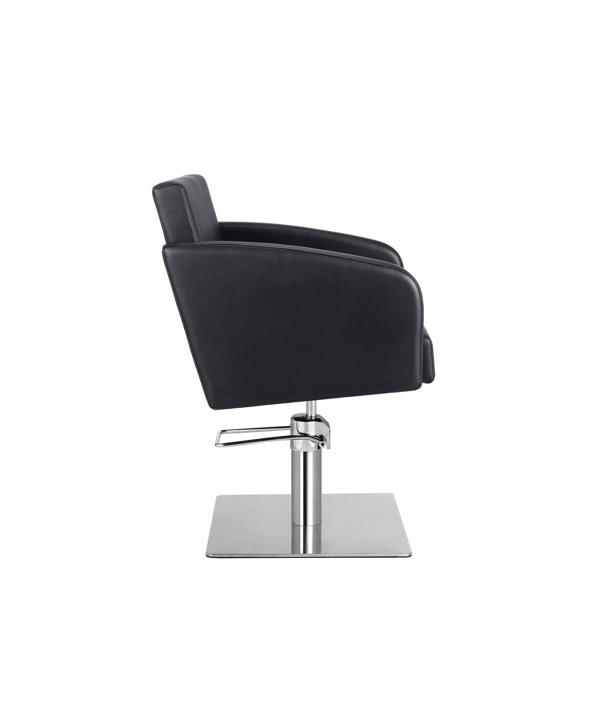 Hairdressing chair that combines square and rounded lines.