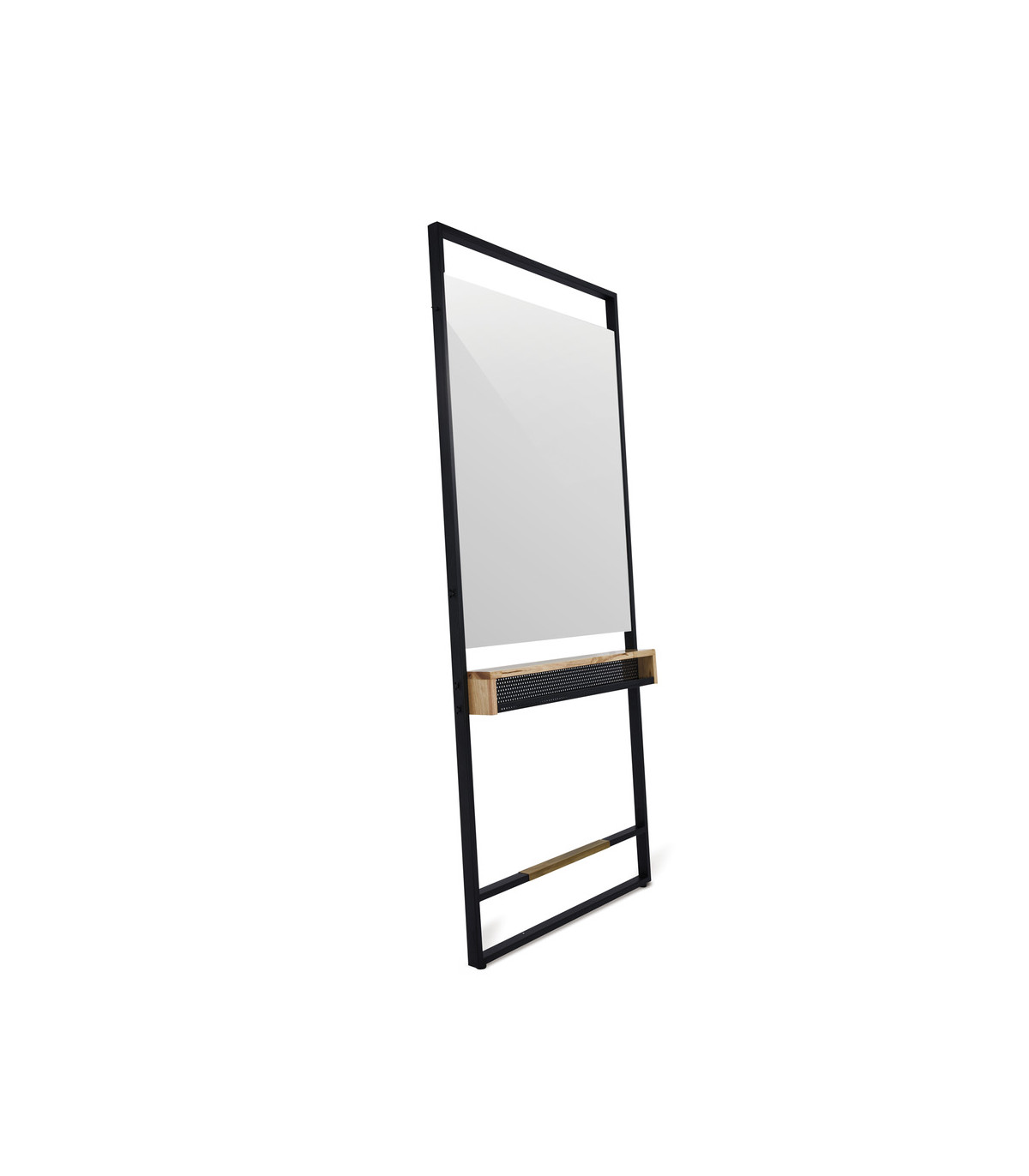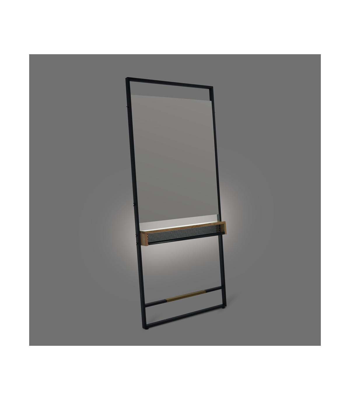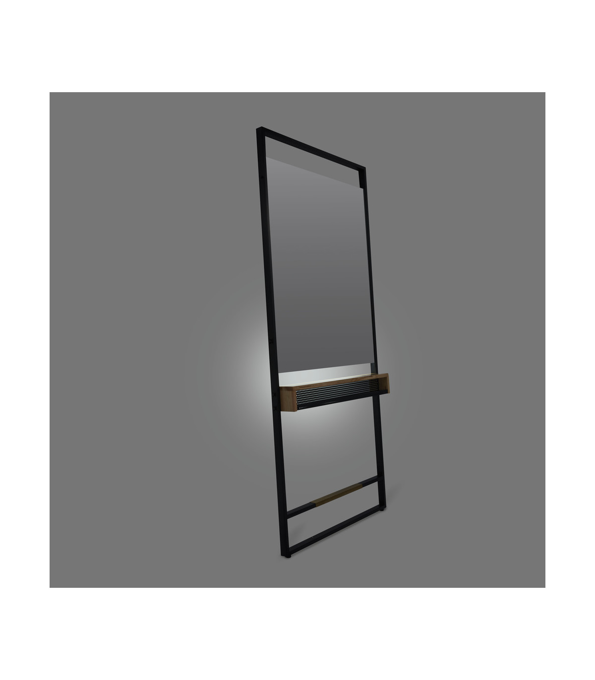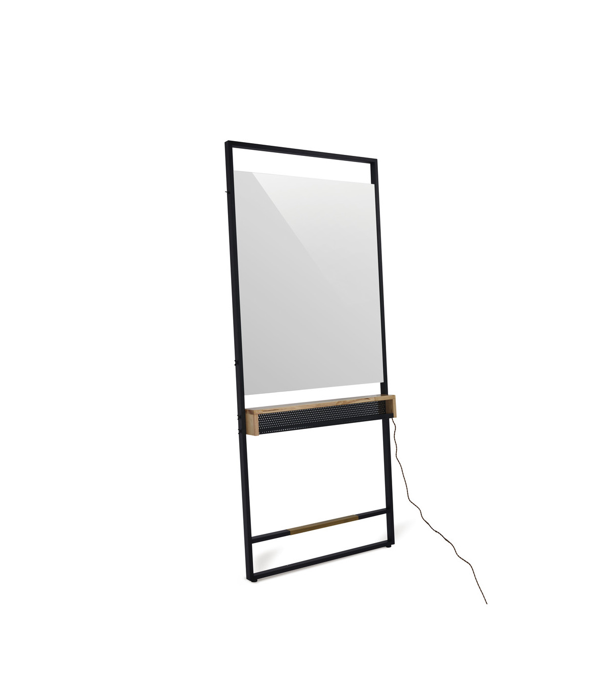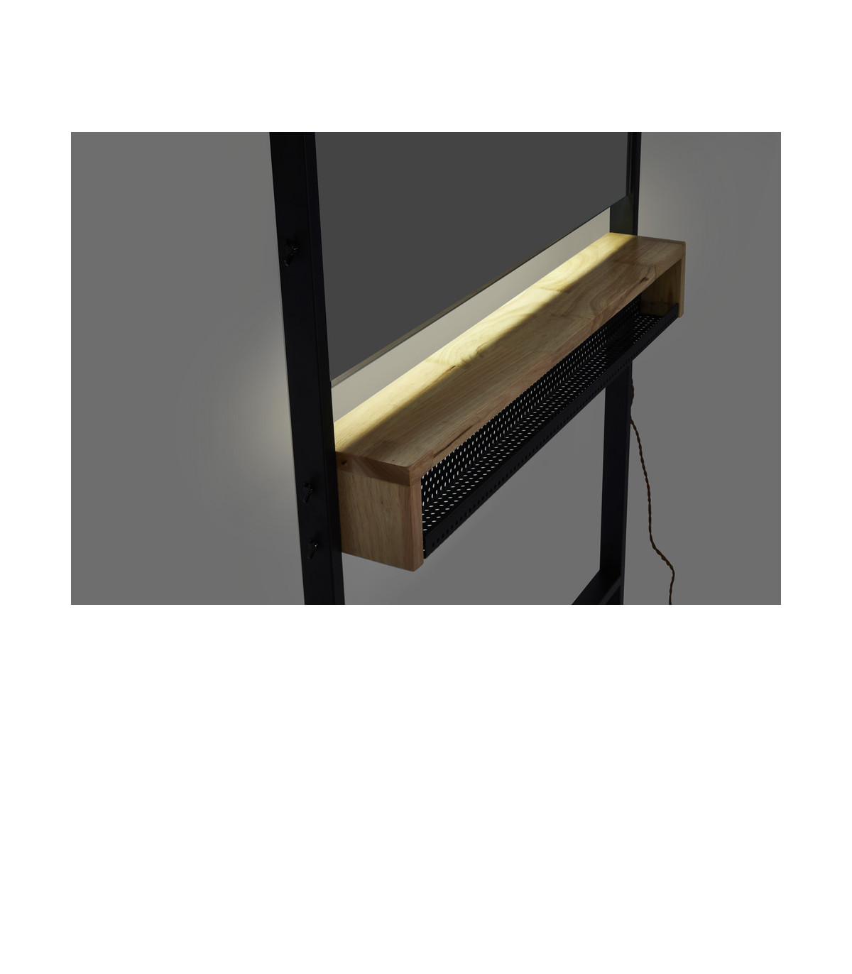 Its structure is made of black-painted metal, and it includes a shelf in solid oak wood with a metallic interior.