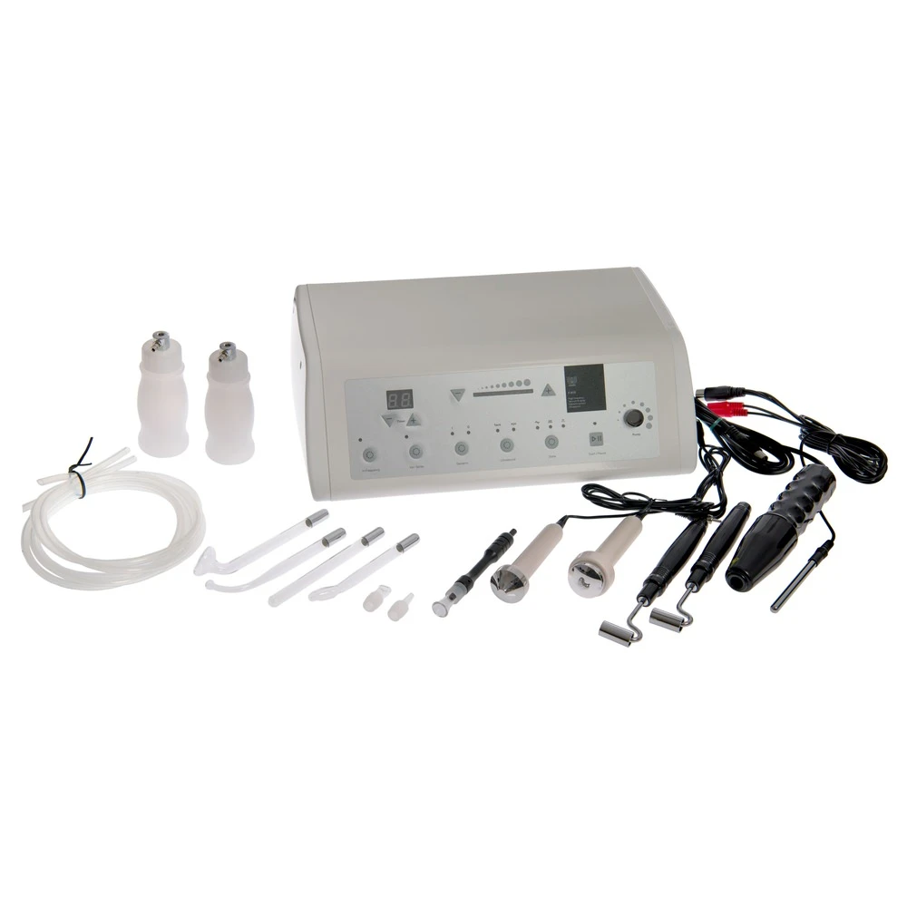 Equipo de belleza que combina 5 funciones: alta frecuencia, ultrasonidos, corriente galvánica y succión y pulverización.