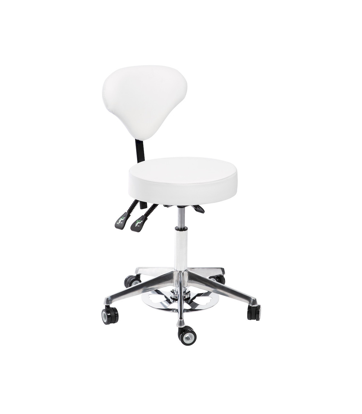 Ajustes Avanzados: Este Taburete auxiliar cuenta con una altura ajustable mediante un pistón de gas, que puede ser controlado tanto por un mando de control como por un mando de pie. Además, ofrece la posibilidad de ajustar la inclinación del respaldo y del asiento mediante un mando de control. También permite ajustar la altura del respaldo según las necesidades del profesional.