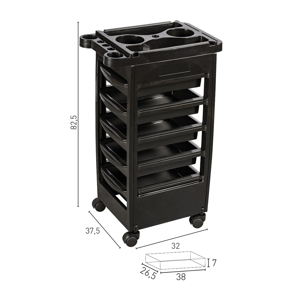 Con ruedas para una movilidad sin esfuerzo, una bandeja superior antideslizante preformada, espacios específicos para colocar utensilios sin riesgo de caída, porta secador, organizadores y 5 bandejas extraíbles, el Carrito de Peluqueria Ferrara se presenta como un aliado indispensable. Este carro no solo facilita la organización y accesibilidad de los utensilios y productos esenciales, sino que también se integra armoniosamente en el espacio de trabajo, aportando un toque de elegancia y profesionalismo.