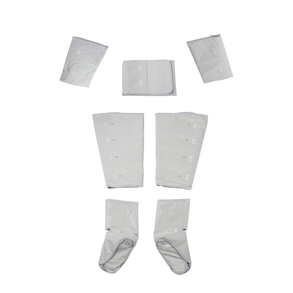 Comprend un ensemble de pressothérapie avec 2 bottes, 2 manchons pour les cuisses, 2 manchons pour les bras et une ceinture abdominale