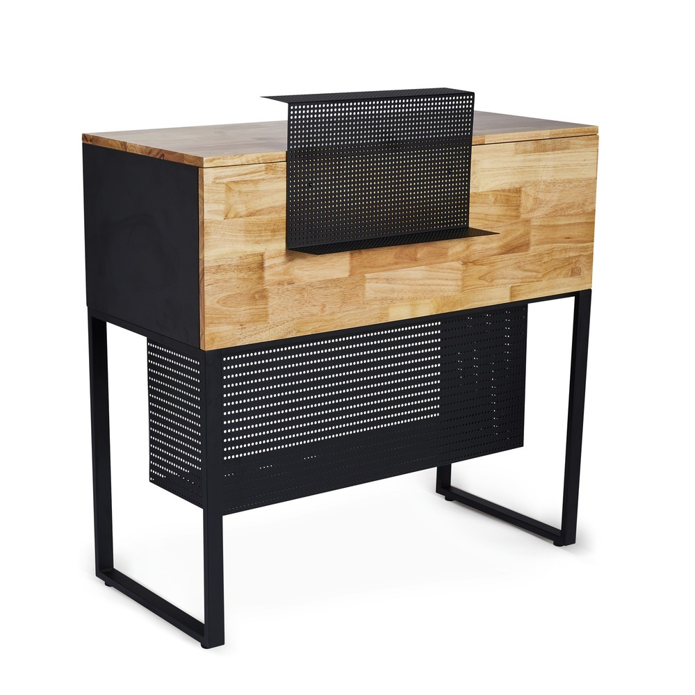 Dans un salon de coiffure biologique, chaque détail compte. C'est pourquoi l'Accueil Coiffure Finch comprend un espace inférieur en tôle perforée pour le rangement. Cet espace est parfait pour stocker des produits de coiffure, des outils et d'autres éléments nécessaires au quotidien.