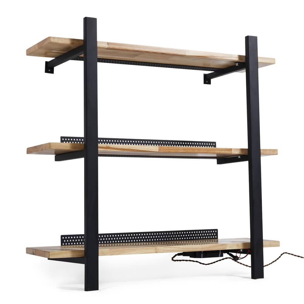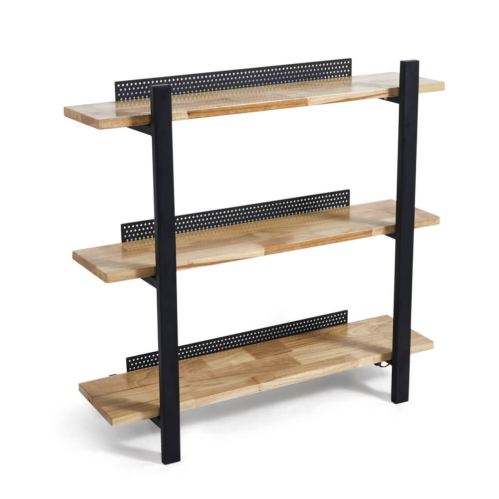 Il est composé d'une structure métallique de couleur noire mate. Les étagères sont une combinaison de bois de chêne massif et de plaques métalliques perforées.
