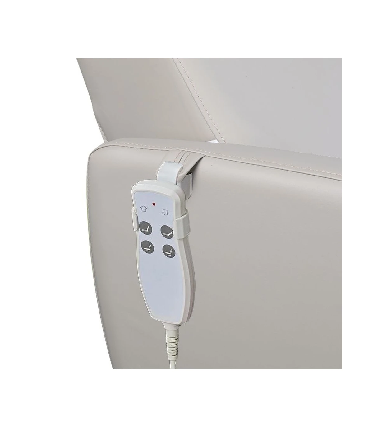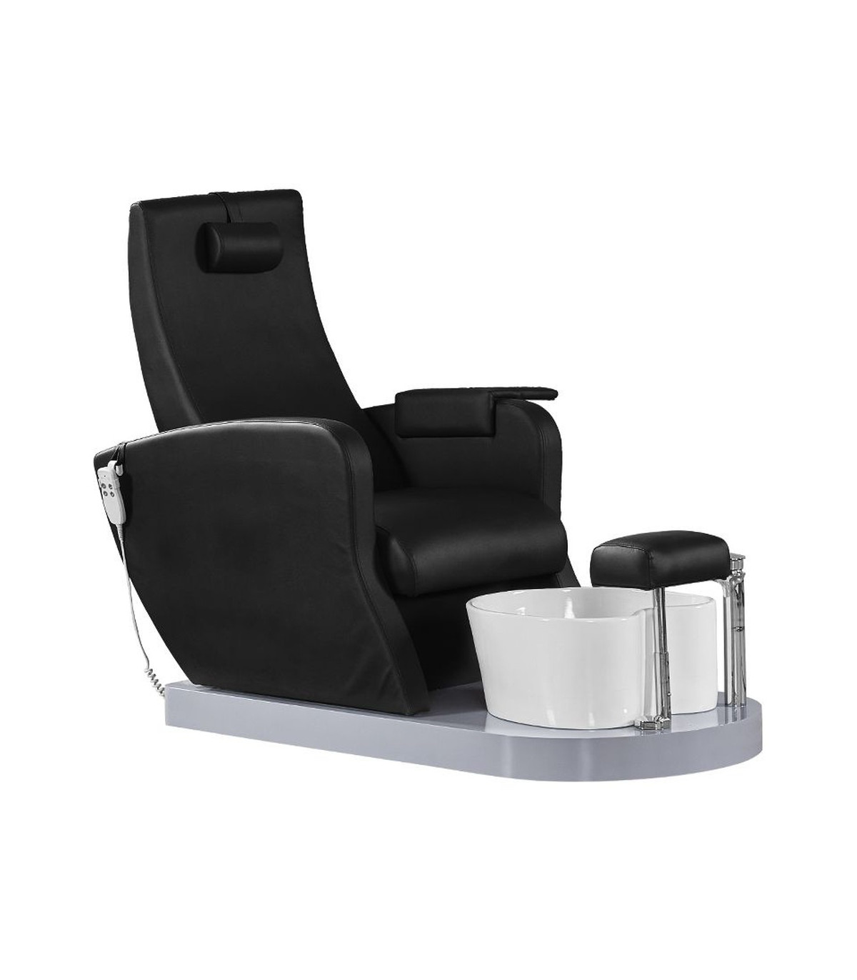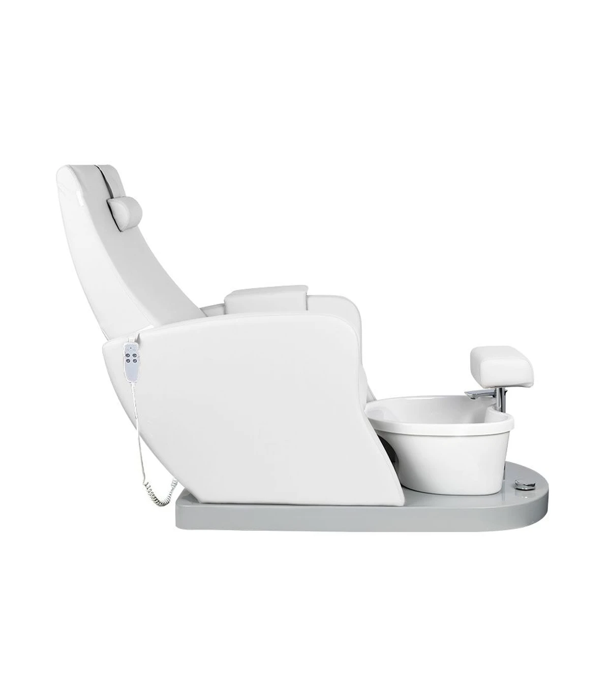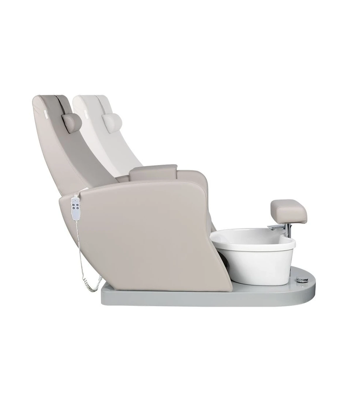 Cette chaise de pédicure est équipée de commandes électroniques pour le siège, l'inclinaison du dossier et le réglage avant/arrière.