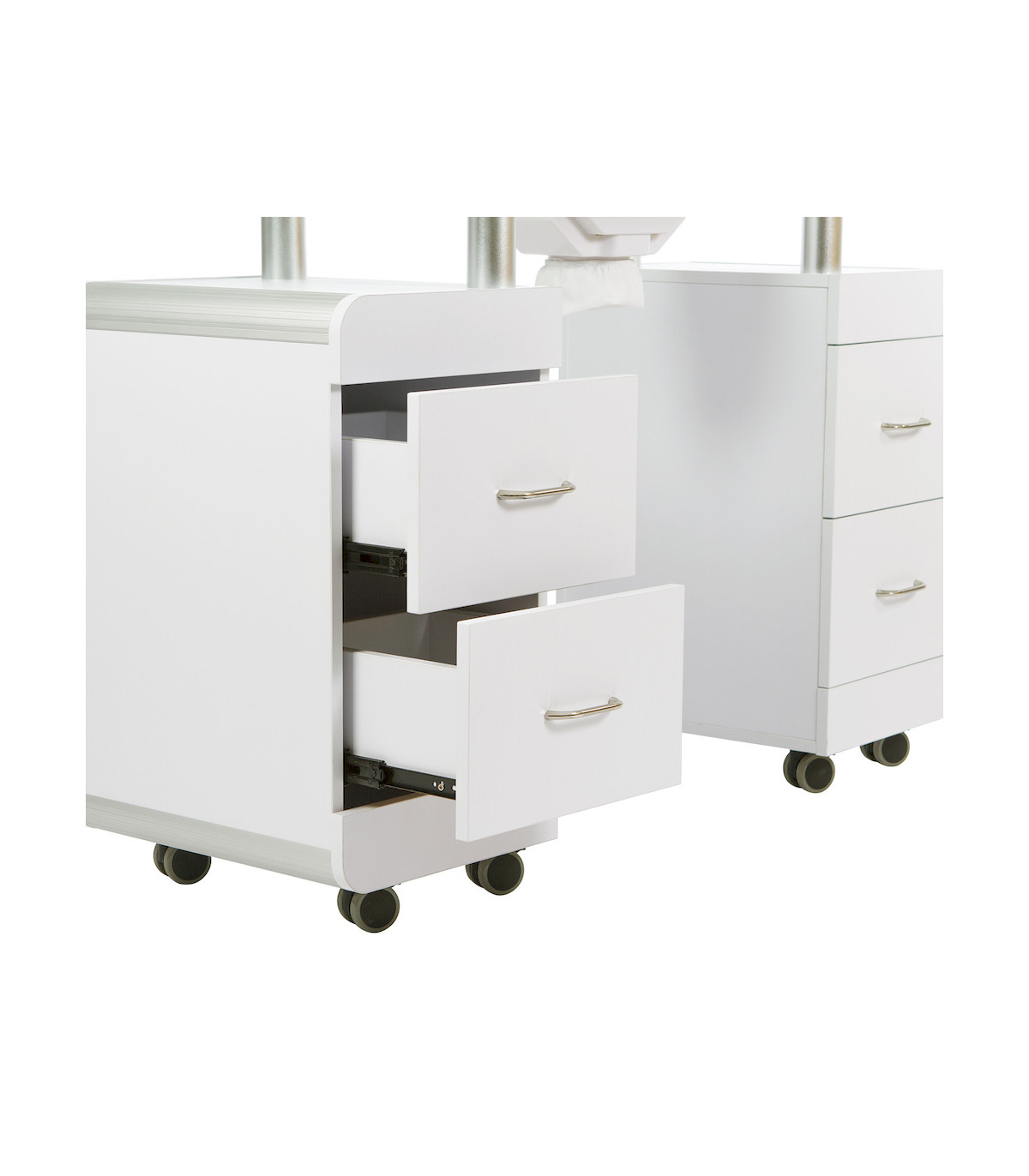 La Table de Manucure Pezi se distingue par son design moderne et fonctionnel. Elle dispose de tiroirs spacieux pour le rangement des produits et outils, d'une surface résistante et facile à nettoyer, et de roues pour faciliter sa mobilité. De plus, elle intègre une aspiration intégrée garantissant un environnement sans poussière, protégeant la santé du professionnel et du client.
