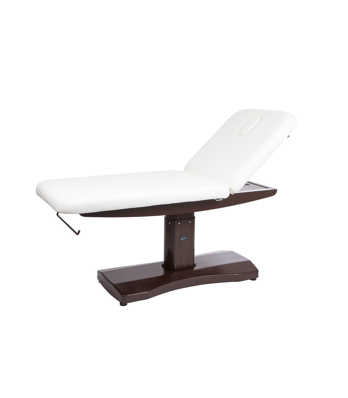 Équipée de 2 moteurs, cette table permet des ajustements de hauteur et d'inclinaison du dossier, garantissant que chaque client puisse trouver la position la plus confortable pour son traitement. De plus, elle dispose d'un trou facial et d'un porte-rouleau intégré conçus pour maximiser le confort et la fonctionnalité pendant les traitements.