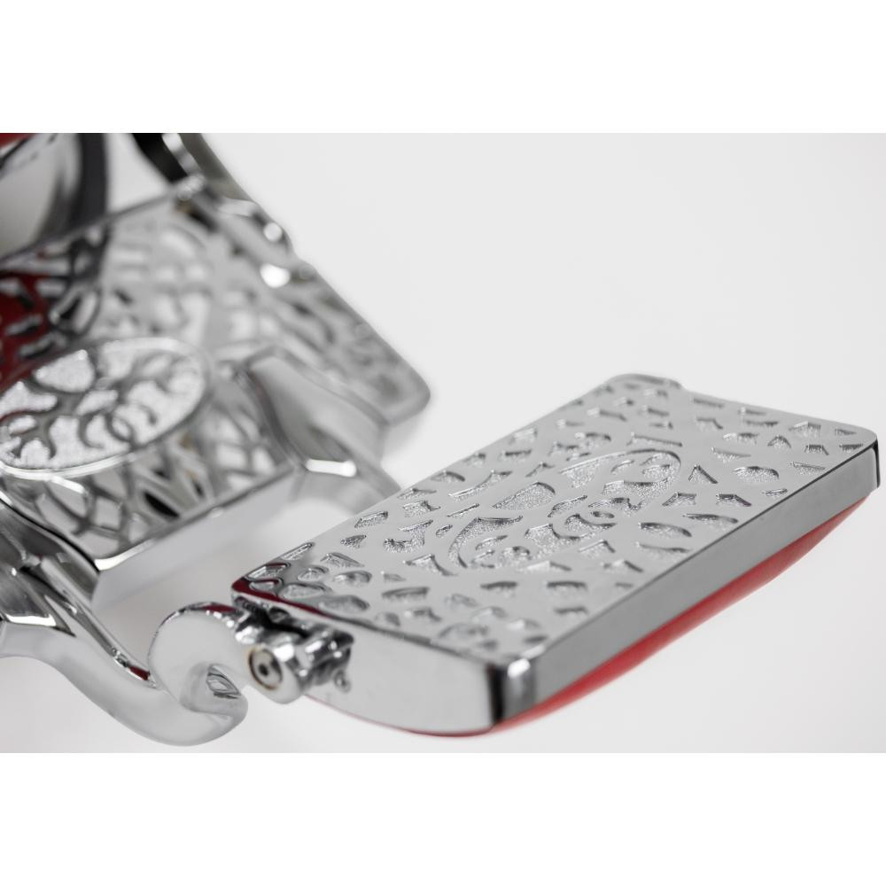 O elegante apoio de pés reversível e reclinável fabricado em alumínio proporciona tanto funcionalidade como estética ao conjunto. Esta característica permite ajustar a posição das pernas do cliente segundo o tipo de serviço, sendo especialmente útil para barbas completas e serviços de relaxamento que requerem posicionamento ótimo e conforto total.