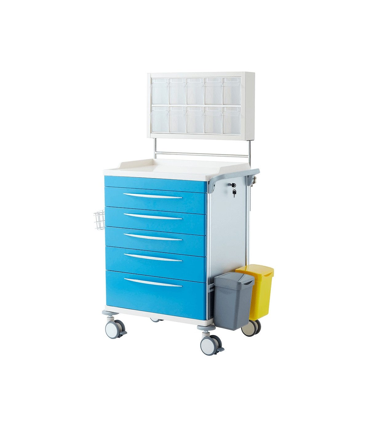O carrinho também conta com 10 divisórias transparentes de policarbonato, o que permite organizar os medicamentos e equipamentos de forma eficiente. Além disso, o carrinho possui duas lixeiras, um contentor de agulhas e uma cesta de arame de aço inoxidável 304, o que facilita a eliminação de resíduos e a organização de suprimentos.
