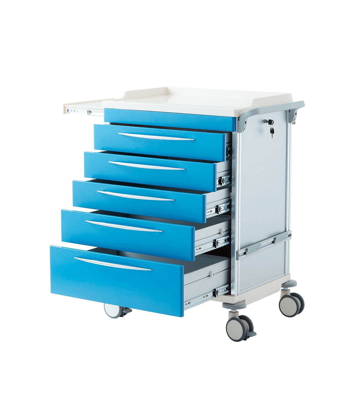 O carrinho é fabricado com uma liga de alumínio e ABS, materiais resistentes e duráveis que garantem a longevidade do equipamento. A superfície do carrinho é de ABS branco, um material fácil de limpar que assegura a higiene do carrinho. O carrinho é de cor azul, uma cor que se integra facilmente em qualquer ambiente de cuidados de saúde.