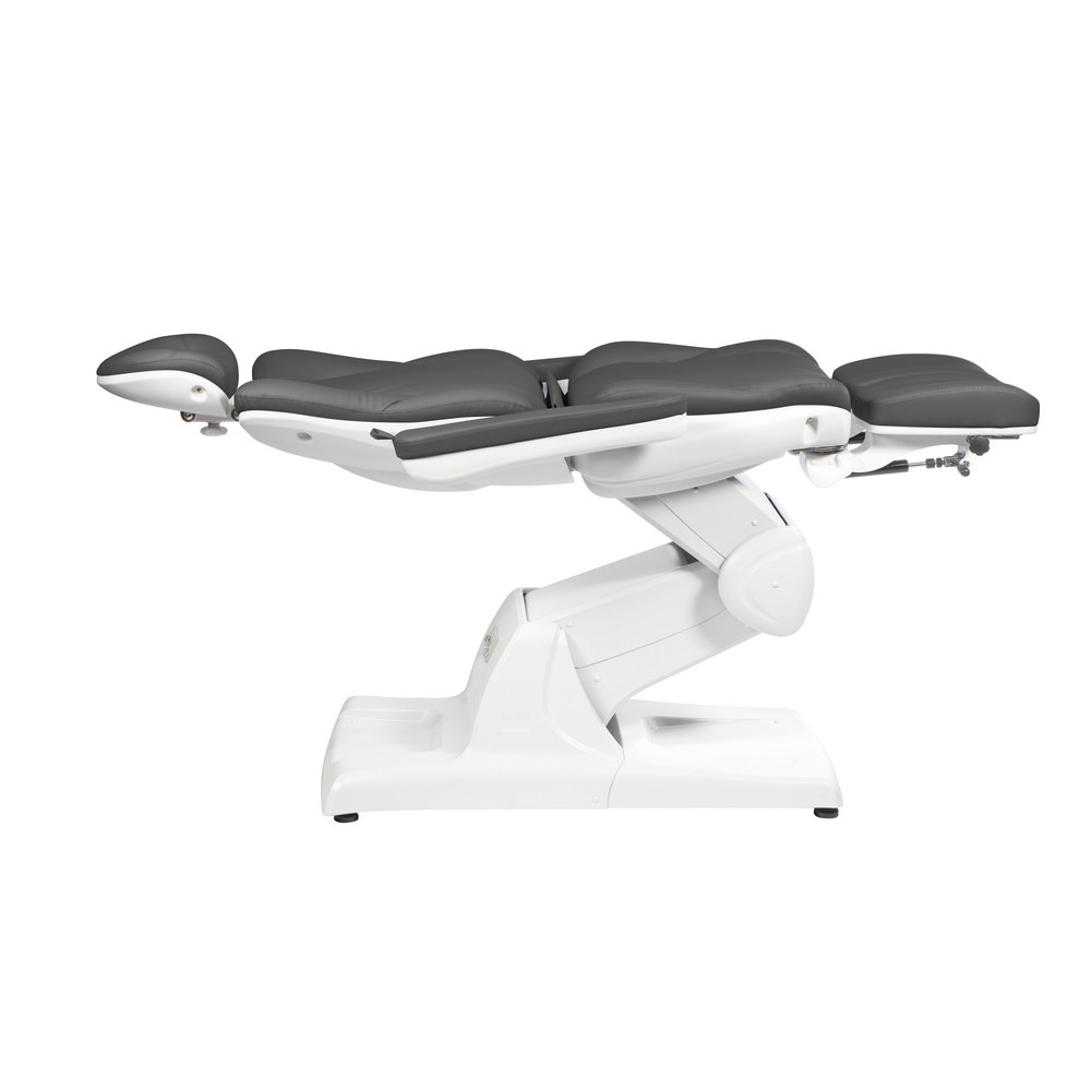 O apoio para os pés é igualmente adaptável, com uma inclinação de até 75 graus para cima e para baixo e de 90 graus da direita para a esquerda. Este movimento, assistido por um pistão a gás, proporciona maior conforto durante o tratamento. Além disso, o apoio para os pés pode ser estendido até 13,5 cm para se ajustar ao comprimento das pernas do cliente.