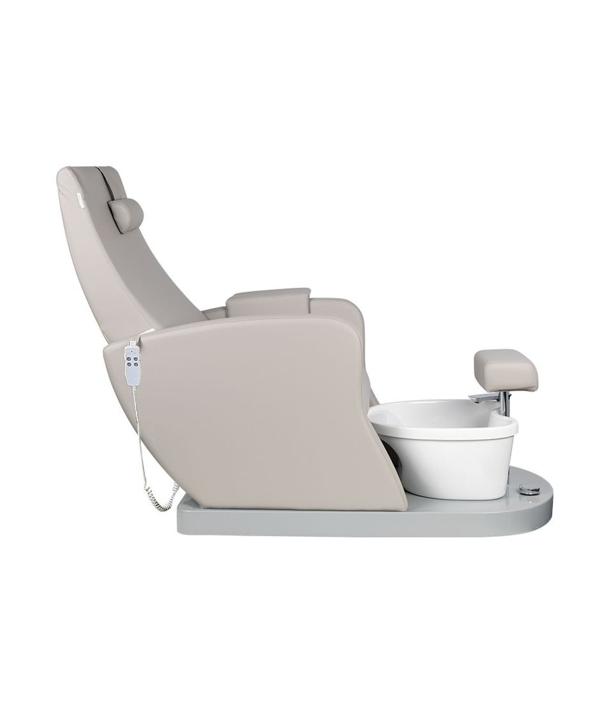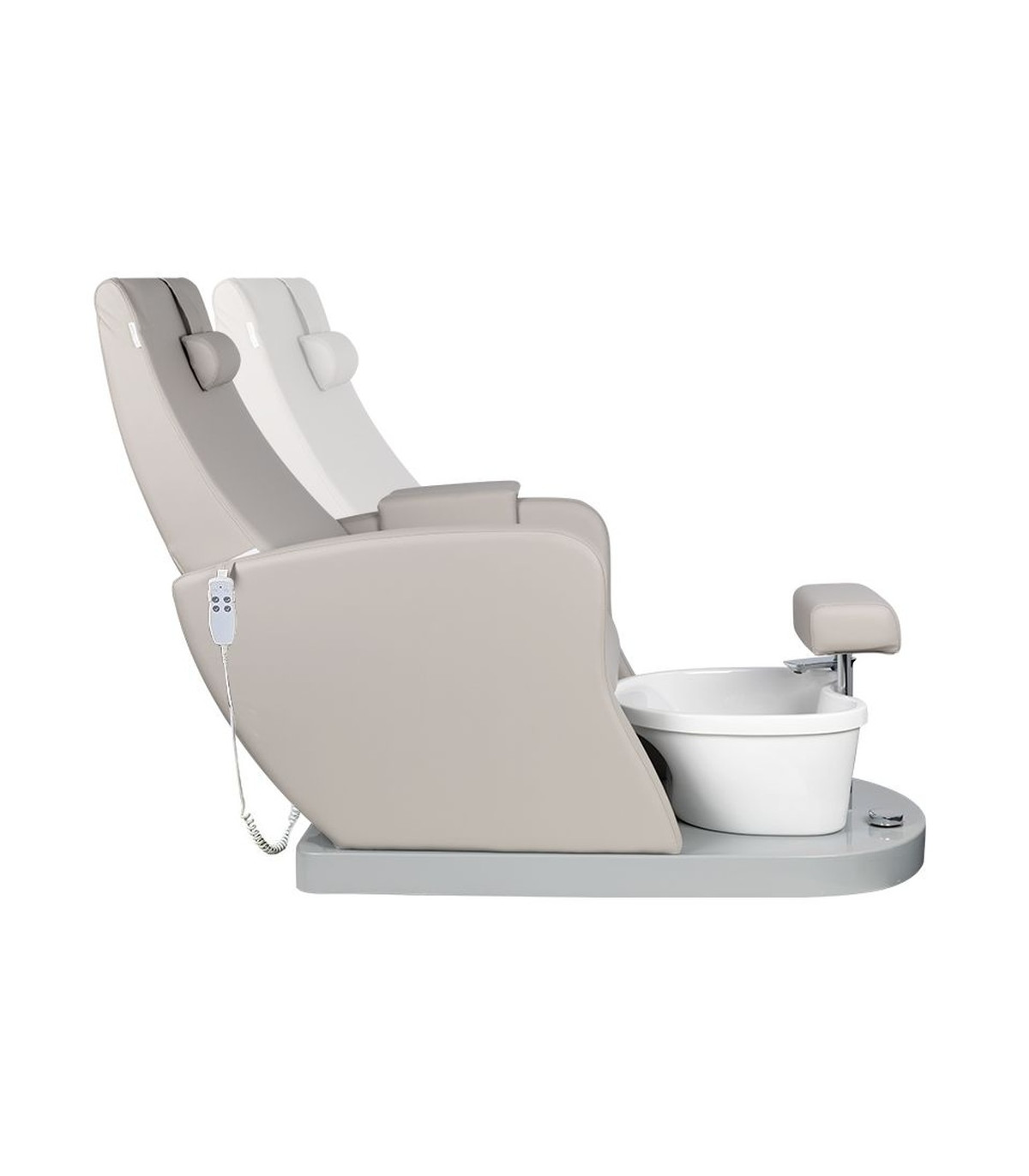 Este sofá de pedicure está equipado com controles eletrônicos para ajuste do assento, inclinação do encosto e posição frente/atrás.