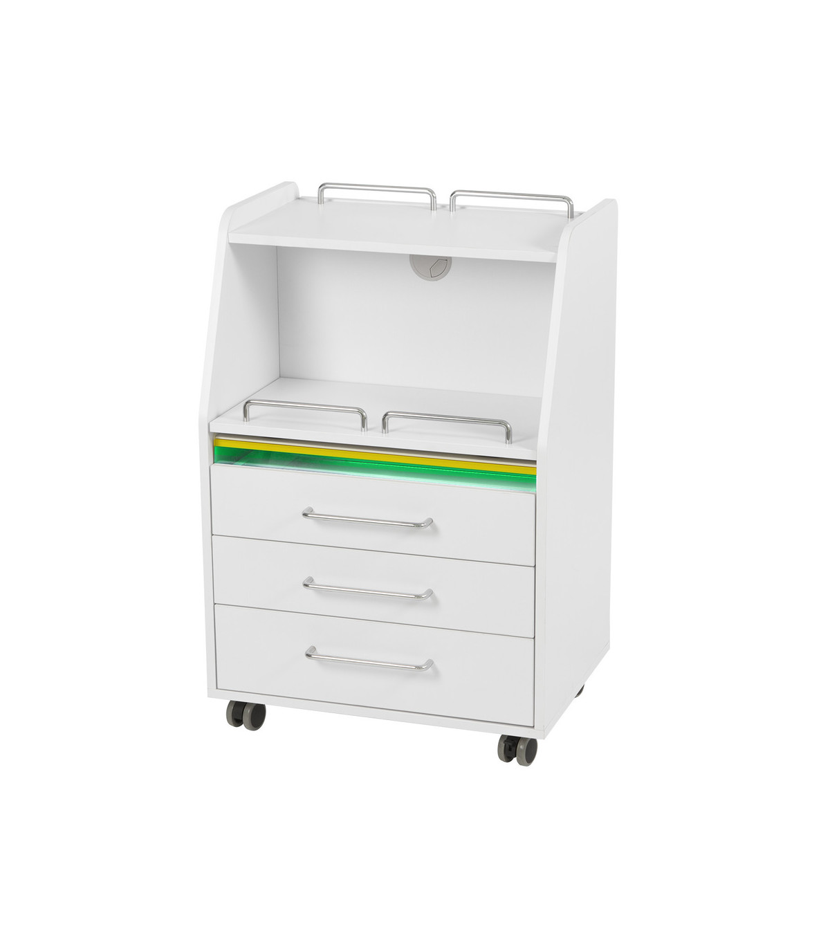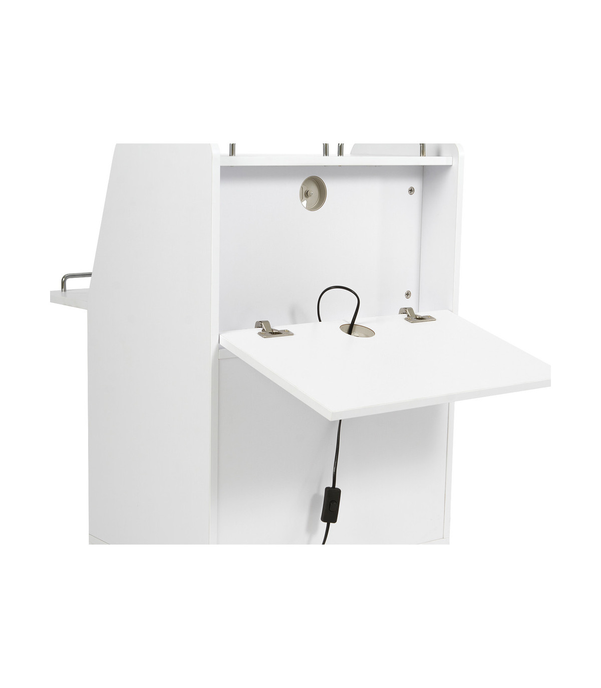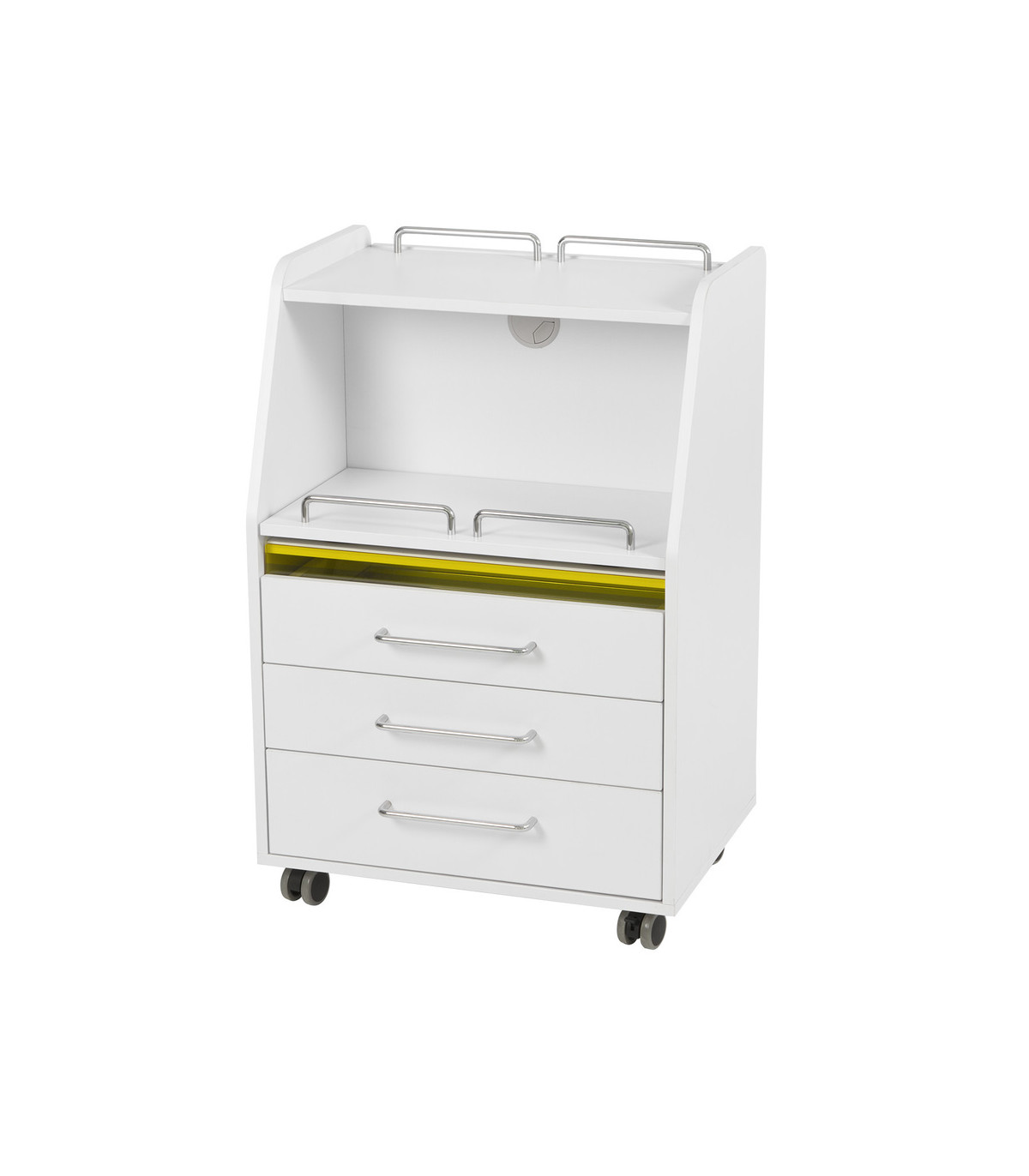 O Carrito de Estética Spin se destaca pelo seu design em madeira compensada de cor branca, conferindo-lhe uma aparência sofisticada e contemporânea. Sua estrutura robusta e suas dimensões de 55x40x82 cm o tornam ideal para qualquer espaço de estética ou spa.