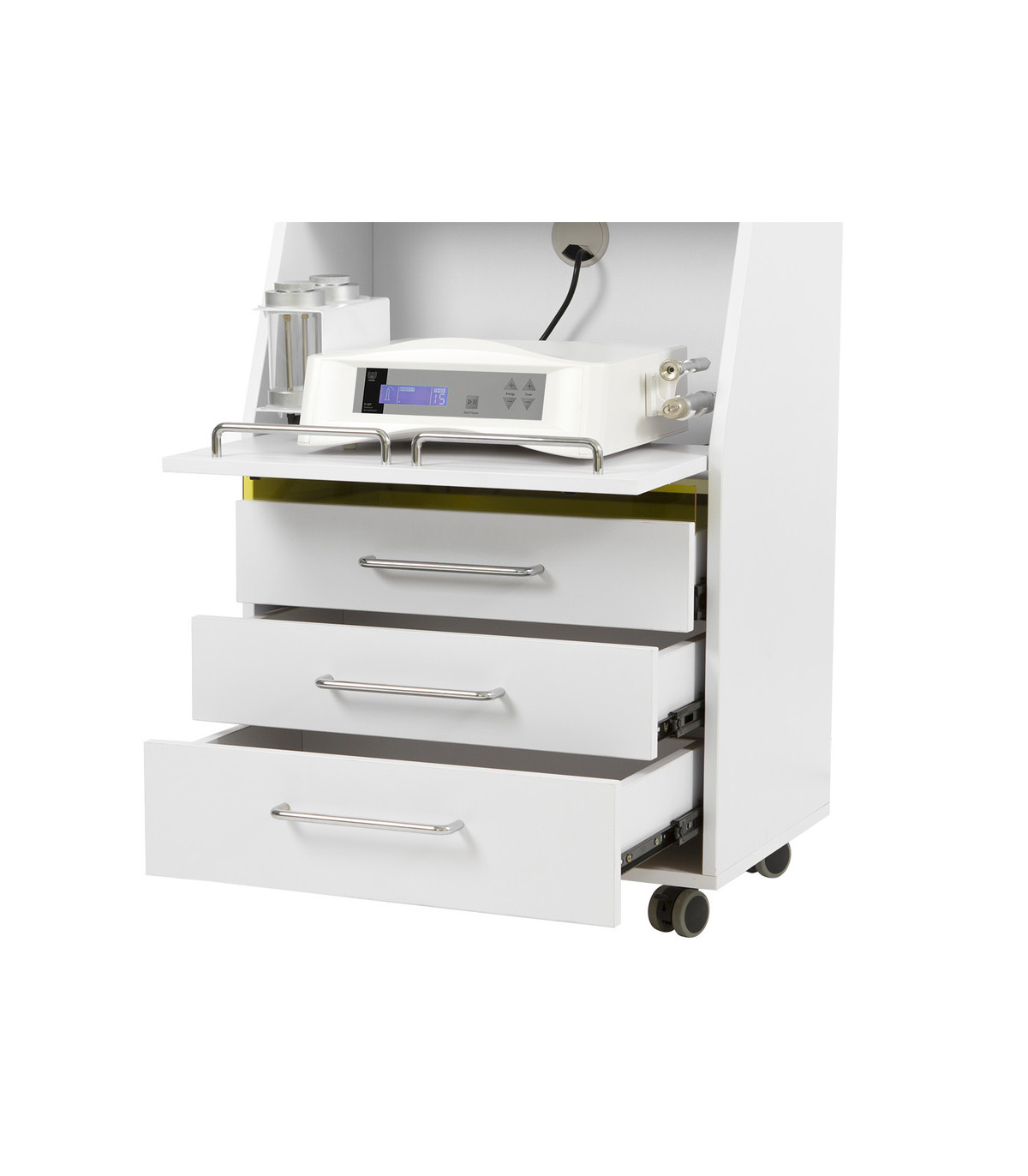 - O carrinho possui vários compartimentos, incluindo um específico com esterilizador UV, além de espaço para armazenamento de outros instrumentos e produtos.