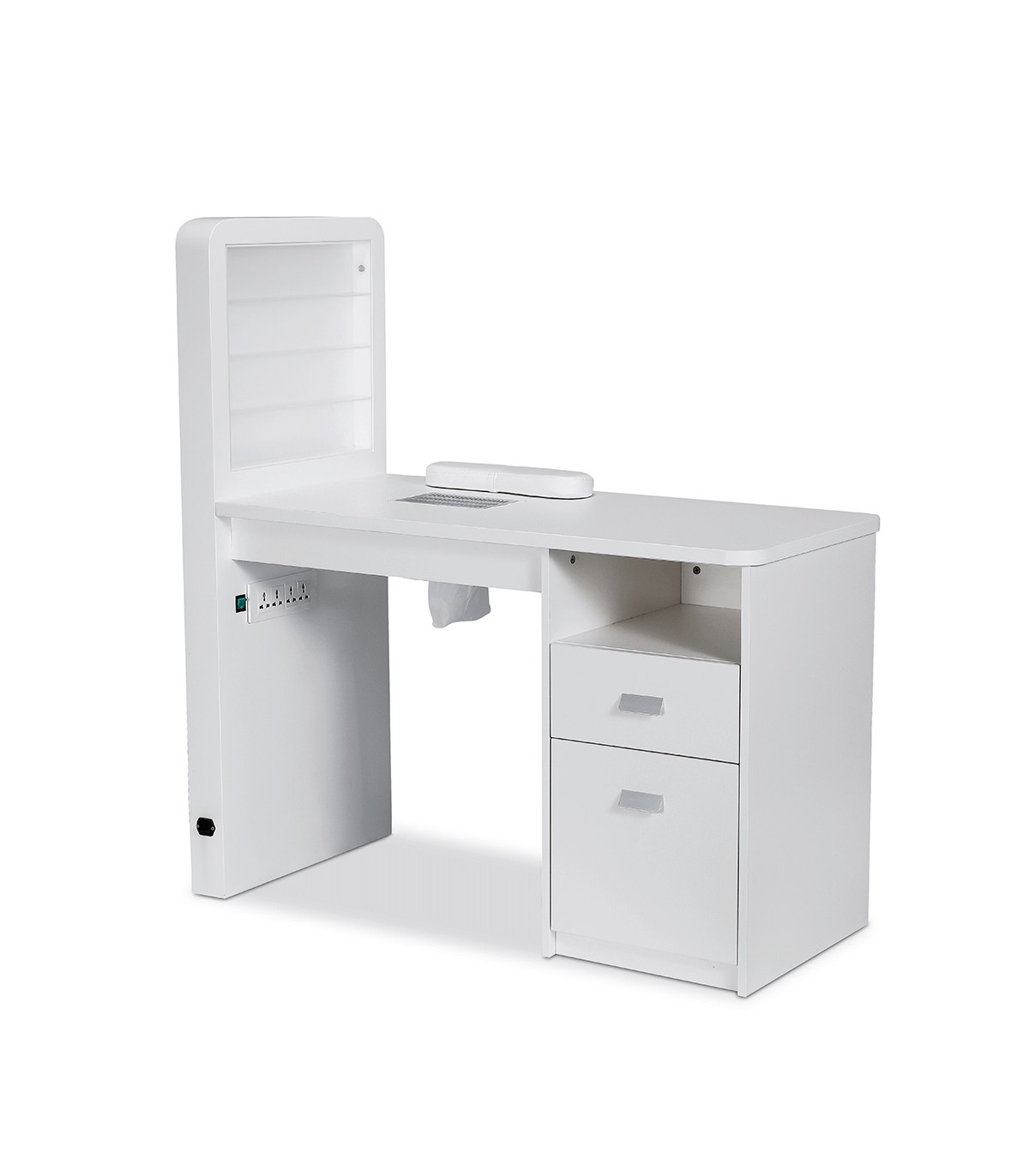 Outra característica importante desta mesa de manicura é o seu aspirador de unhas com coletor de poeira. Este dispositivo garante um ambiente limpo e saudável para os teus clientes e para ti, aspirando a poeira das unhas gerada durante o limar, evitando que se espalhe pelo ar.