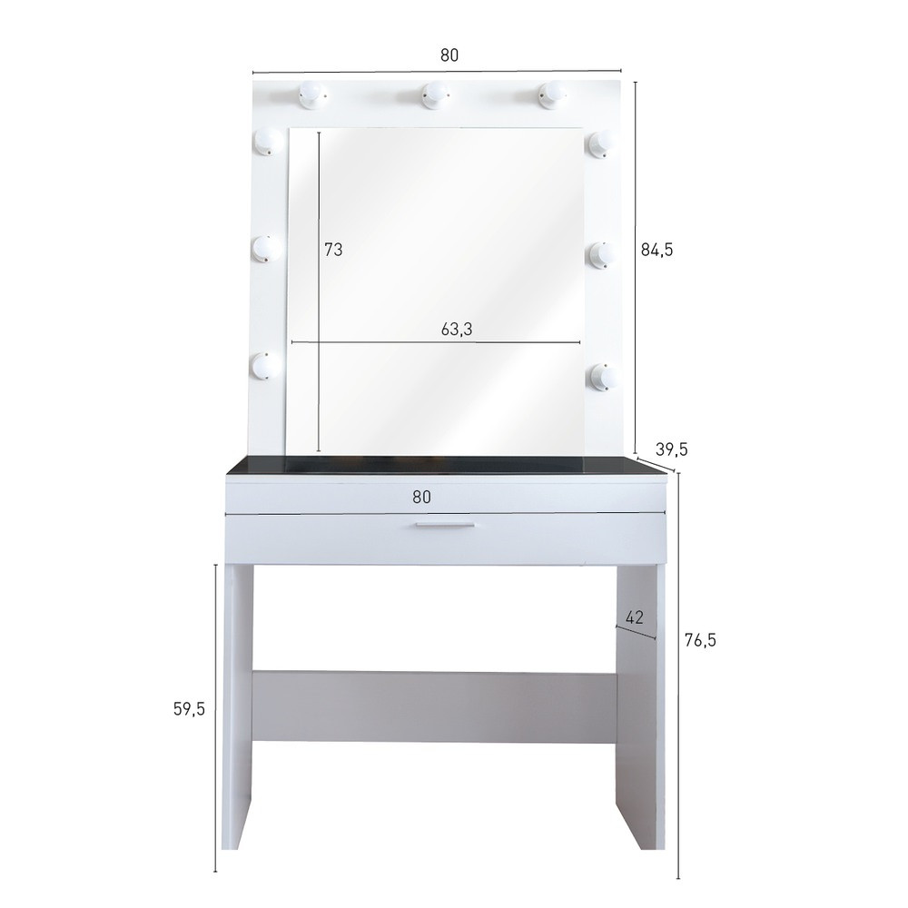 O Toucador de Maquilhagem Com Luz combina perfeitamente design e funcionalidade. Sua estrutura, fabricada com materiais de alta qualidade, garante durabilidade e resistência. No entanto, o que realmente se destaca neste toucador é o seu sistema de iluminação. Equipado com 9 lâmpadas, ele proporciona uma iluminação perfeita para realizar trabalhos de maquilhagem com precisão. Além disso, seu design moderno e elegante o torna uma peça central em qualquer salão de beleza.